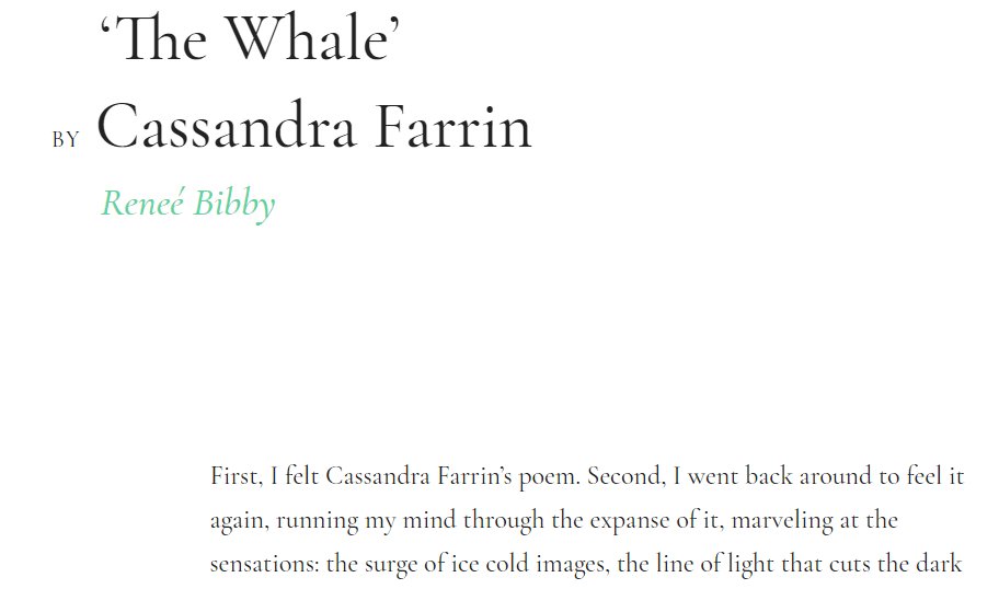 …Line breaks and caesura evoke the voice of an animal, an ancient creature of the deep, breaching the line of water to sing a response, an ode to the inextricable intertwining of fates between animal and man.